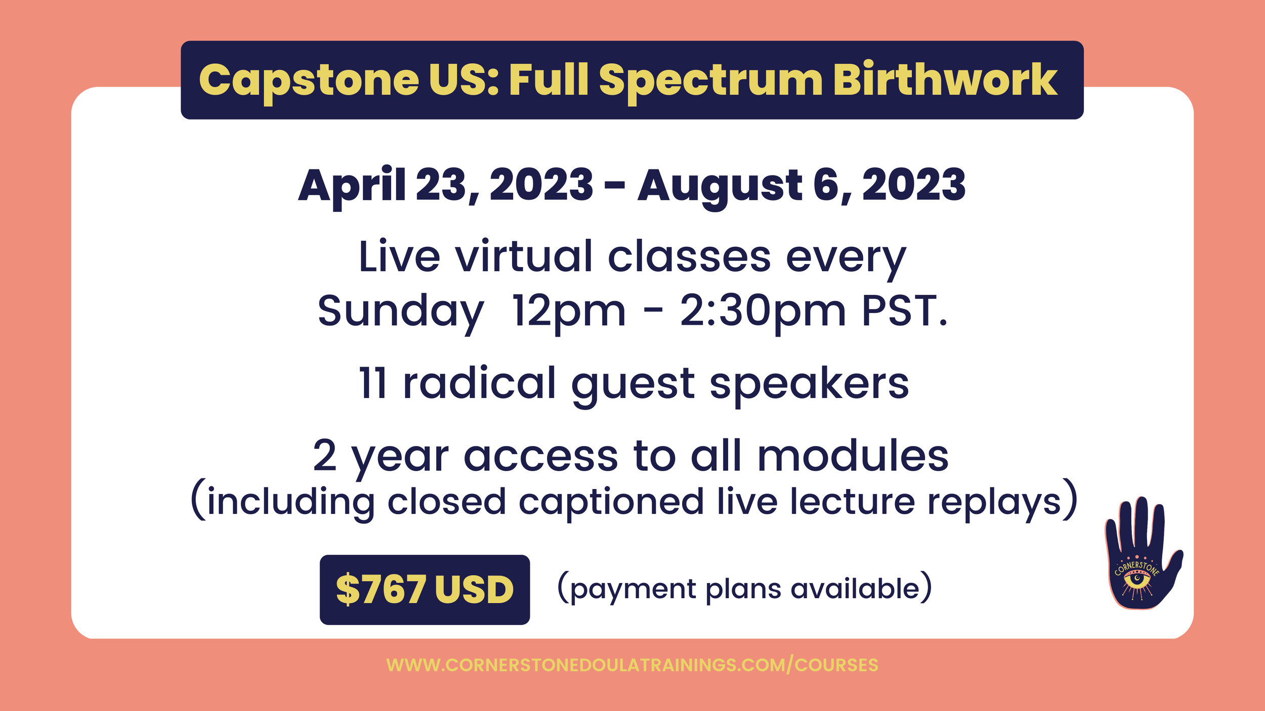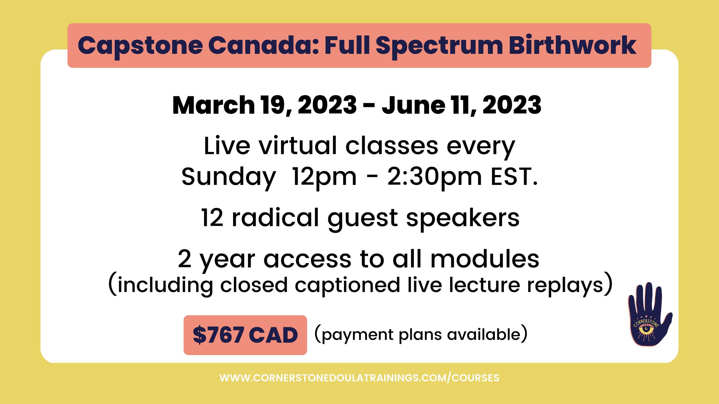 Capstone: Advanced Full Spectrum Birthwork Training is a 14 week community-based learning experience that brings together facilitators from all over Canada and the US to skill share, story tell, guide, and support birthworkers who are interested in delving deeper into the full spectrum of reproductive care work. Our collective goal through Capstone is to deepen the practice of birthwork to become expansive, radical, revolutionary, and transformative.